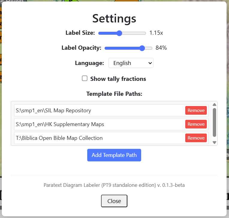 Note: You will only see the option for exporting to a pre-filled file if the Labeler can find the template file you’d need to use. So, for a map from the SIL Map Repository, you’d need to download (and unzip) the SIL Map Repository folder. Then, you’d need to specify the path to that folder in the Settings (⚙️), like this:
